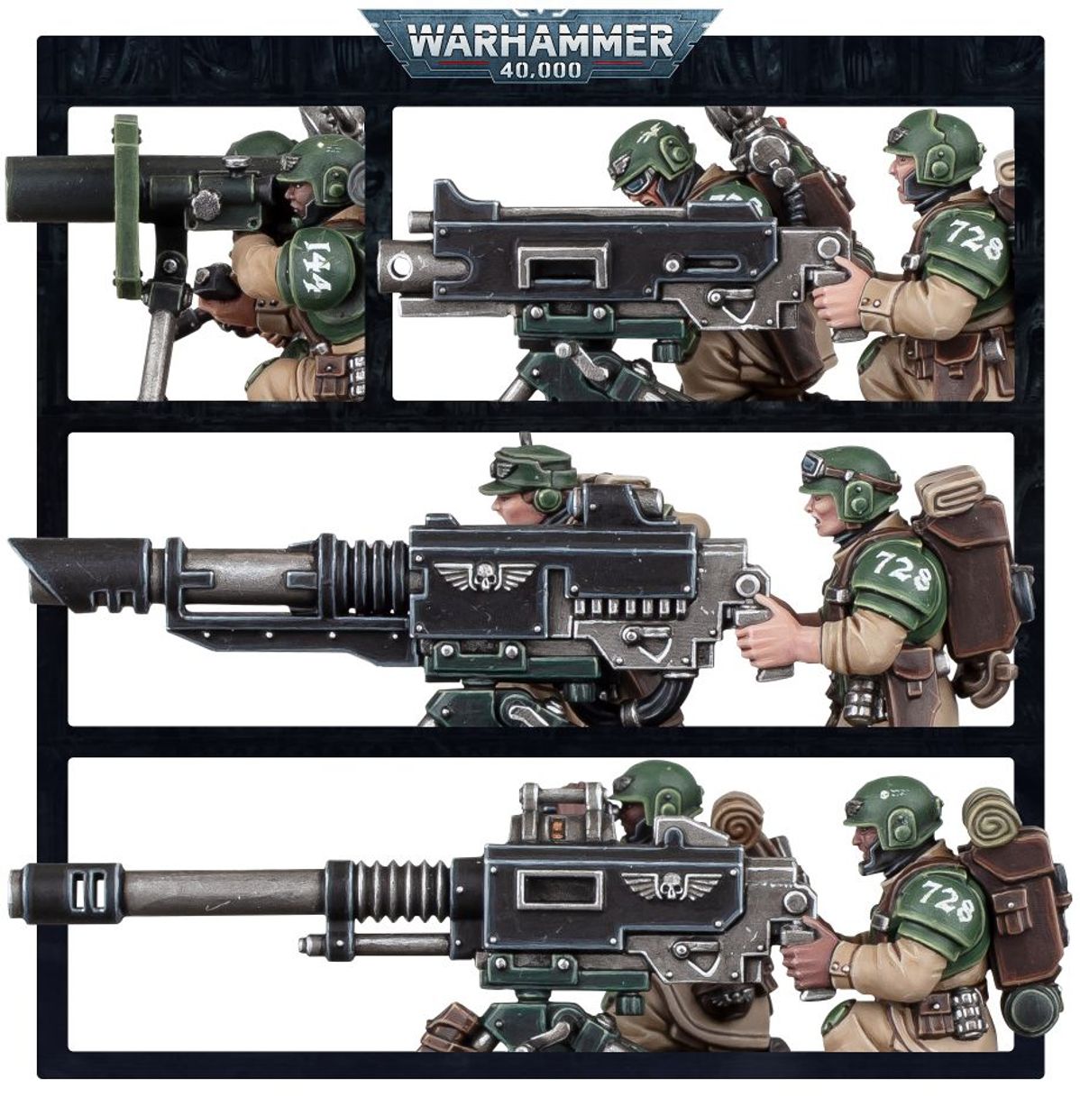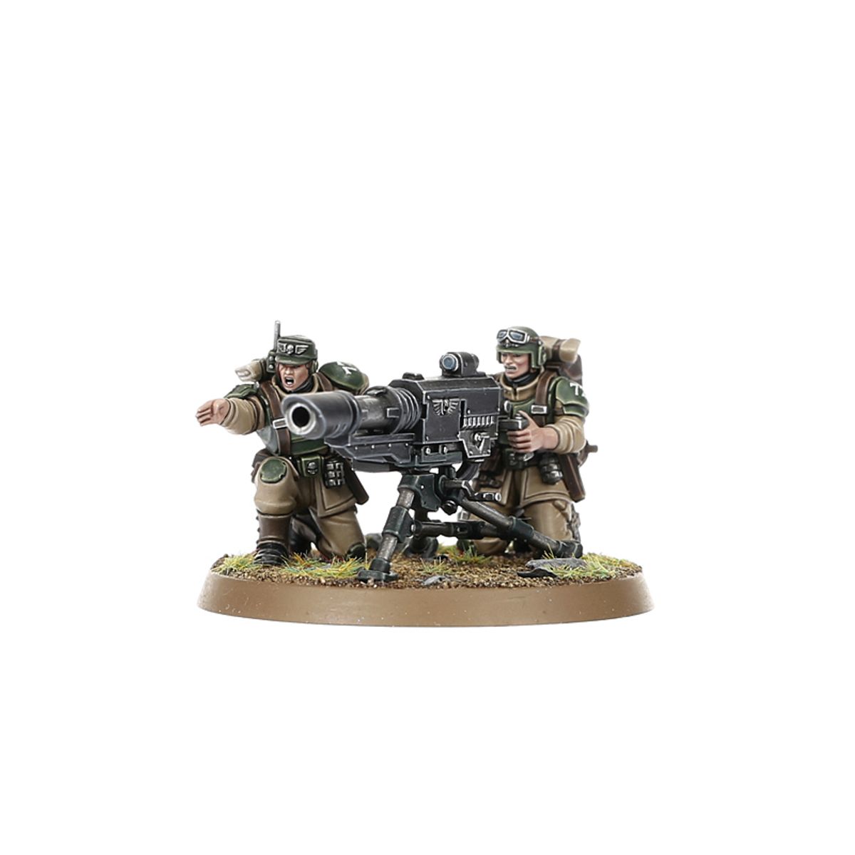 This multipart plastic kit builds three Heavy Weapons Teams – paired infantry soldiers crewing a portable gun. Each team can be armed with your choice of a heavy bolter, missile launcher, mortar, autocannon, or lascannon. The kit includes plenty of cosmetic options to mix things up – extra ammo, seven different heads, a variety of poses, and equipment such as vox-sets and magnoculars for spotters and loaders – so no two teams ever need look alike. These teams can be fielded together as Heavy Weapons Squads, or combined with the Cadian Shock Troops kit to form Infantry Squads with attached Heavy Weapons Teams.