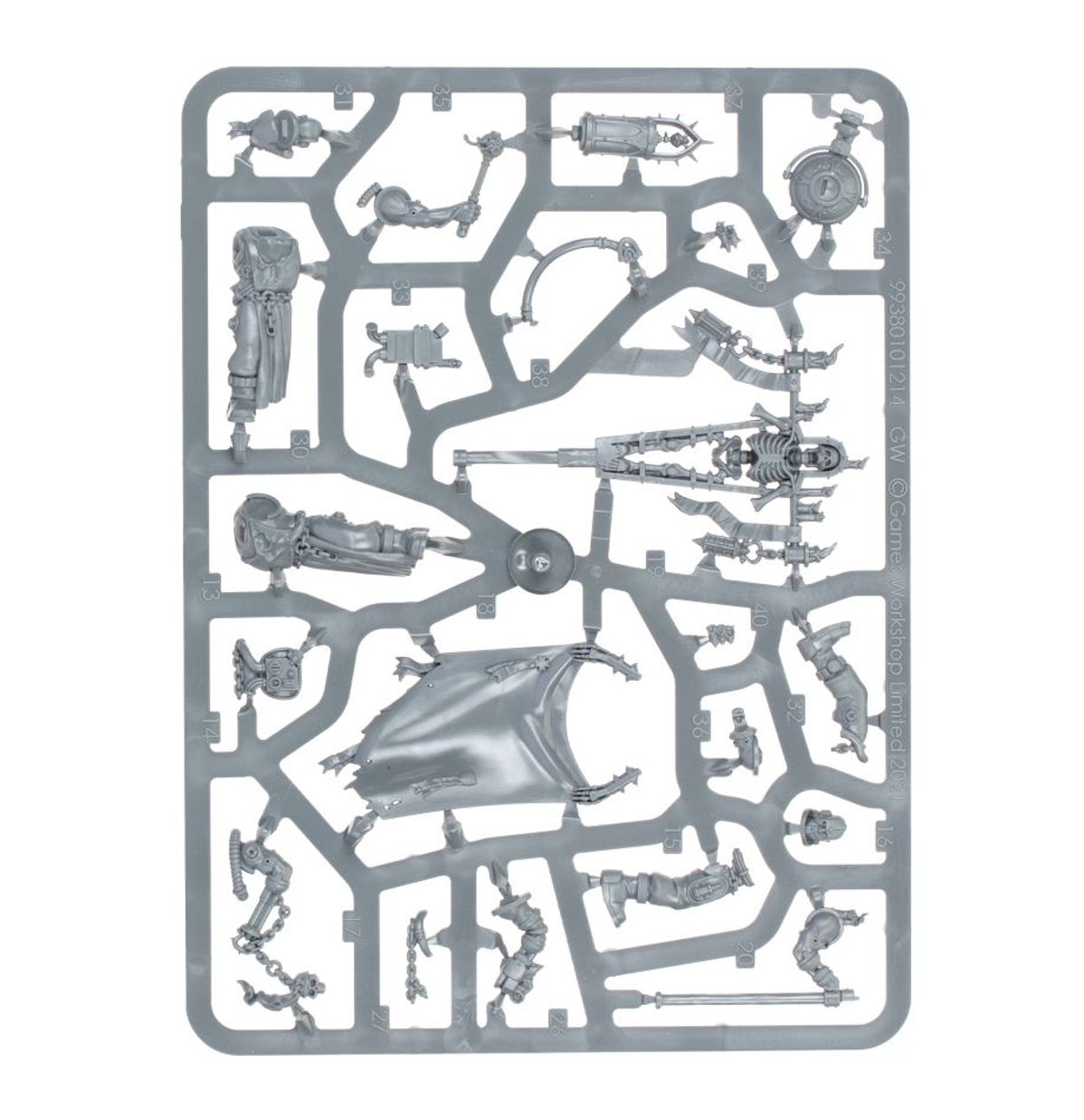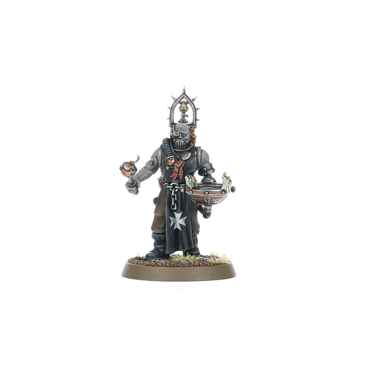 The kit is comprised of 40 plastic components, with which you can assemble one Chaplain Grimaldus and his three Cenobyte Servitors, and is supplied with one Citadel 40mm round base and three Citadel 28mm round bases. These miniatures are supplied unpainted and require assembly – we recommend using Citadel Plastic Glue and Citadel paints.