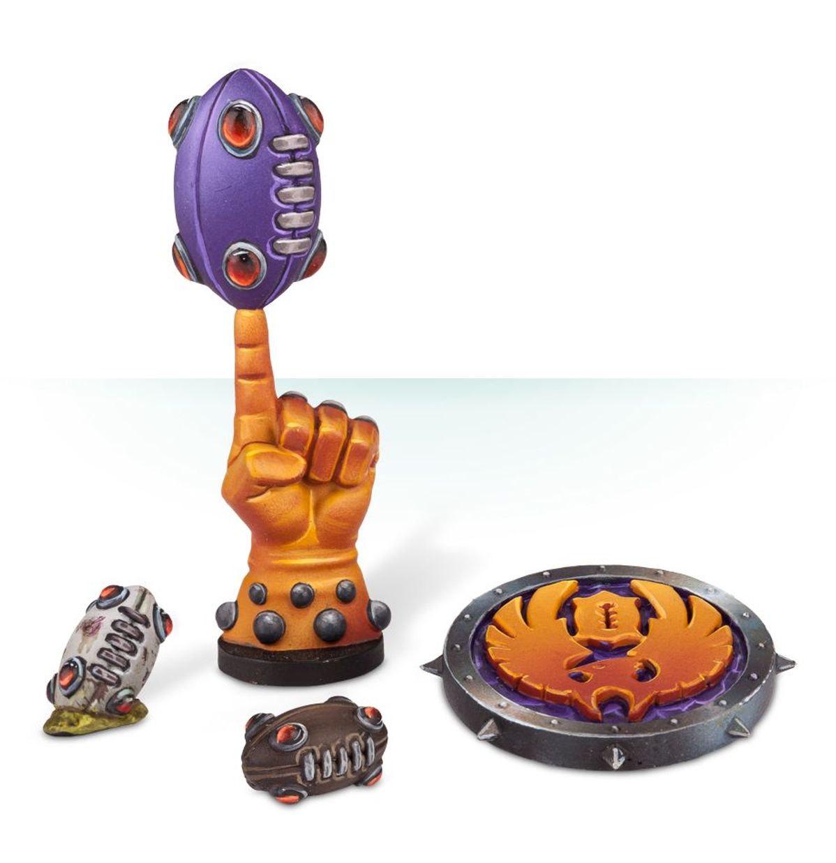 There are a host of extras in the kit – 2 turn markers, 2 double-sided score coins and 6 balls, 4 of which are encrusted with opulent gemstones. Supplied with 12 32mm Blood Bowl bases and an Elven Union transfer sheet.