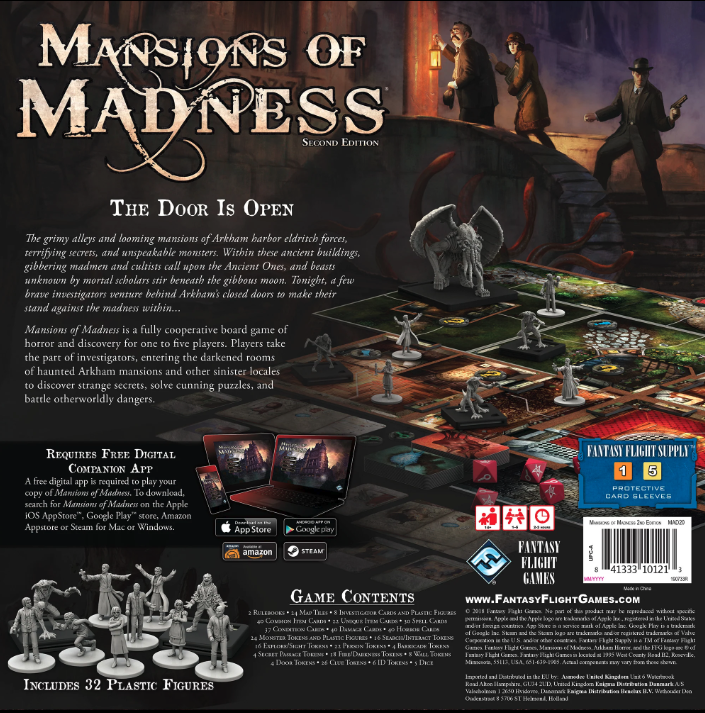 Mansions of Madness Second Edition is a fully cooperative, app-driven board game of horror and mystery for one to five players that takes place in the same universe as Eldrich Horror and Elder Sign. Let the immersive app guide you through the veiled streets of Innsmouth and the haunted corridors of Arkham’s cursed mansions as you search for answers and respite. Eight brave investigators stand ready to confront four scenarios of fear and mystery, collecting weapons, tools, and information, solving complex puzzles, and fighting monsters, insanity, and death. Open the door and step inside these hair-raising Mansions of Madness Second Edition. It will take more than just survival to conquer the evils terrorizing this town.