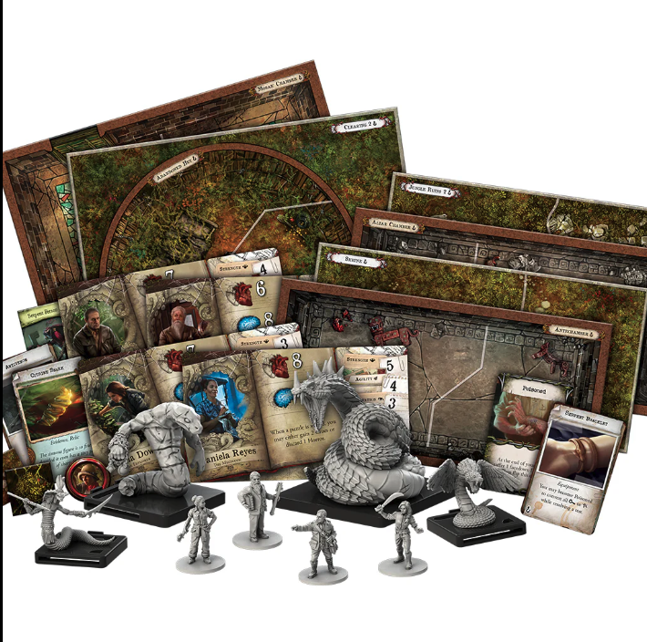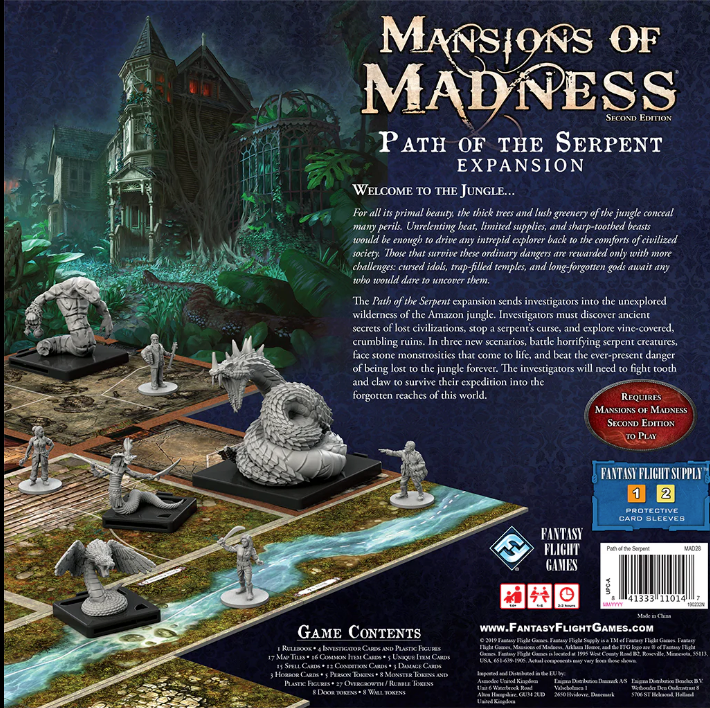 Path of the Serpent is an expansion for Mansions of Madness that sends investigators into the unexplored wilderness of the Amazon jungle. Investigators must discover ancient secrets of lost civilizations, stop a serpent’s curse, and explore crumbling ruins in three new digital scenarios that introduce new investigators, puzzles, and mysteries to tempt the curious to travel deeper into the jungle. You will need to fight tooth and claw to survive as you battle horrifying serpent creatures, face stone monstrosities that come to life, and face the ever-present danger of becoming lost to the jungle forever. Journey into the forgotten reaches of this world and discover the secrets that await!