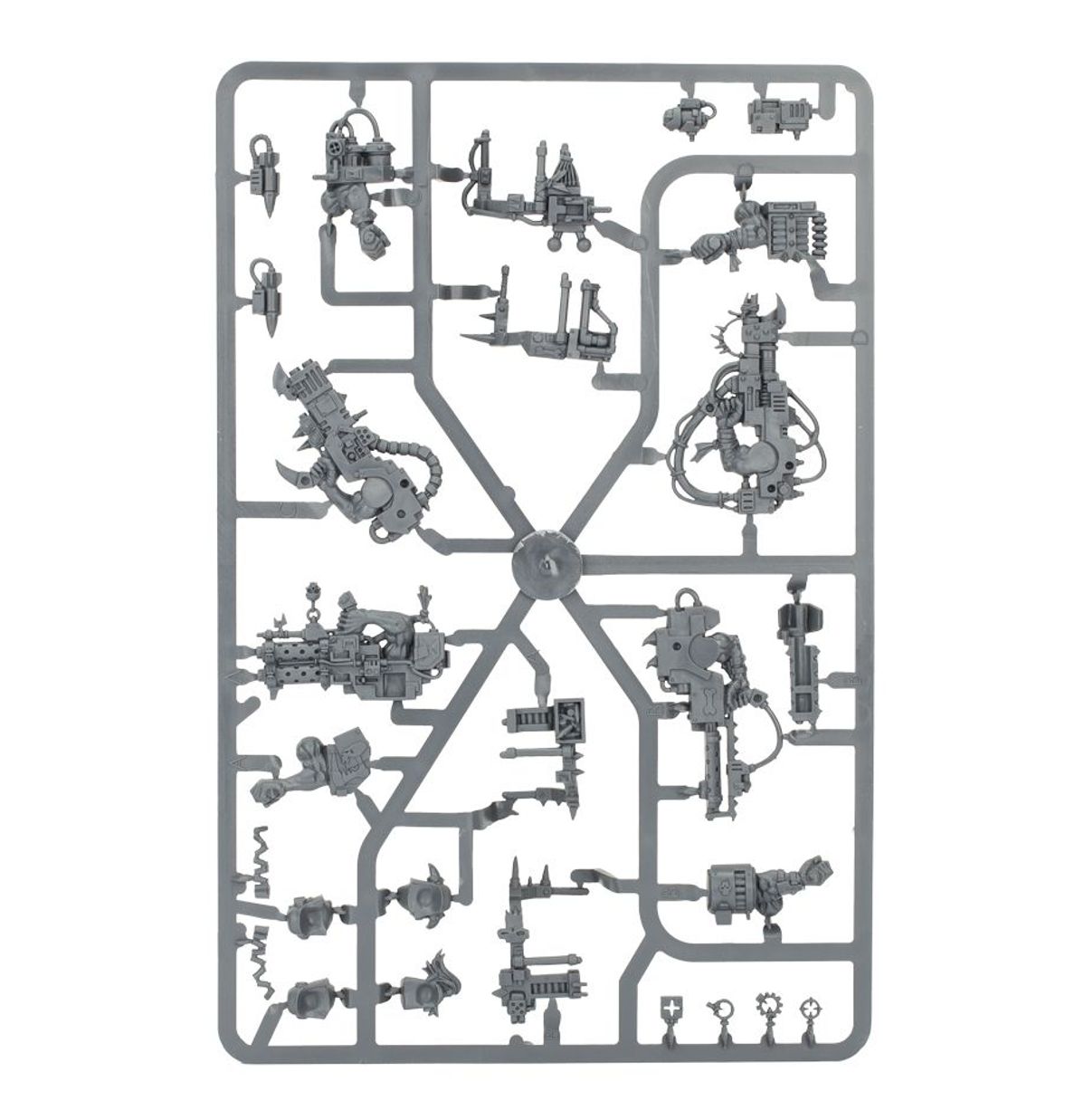 These wiry and muscular Ork models stand wearing an array of bizarre contraptions held up with huge, crude leather straps or bandaged together with material. Some of them wear unusual masks and goggles, others decide to physically sport the tools of their trade – and spanners and wrenches can be discerned above their head or fixed to their bodies. Each of them carries an enormous deffgun and occasionally their toofy maws can be seen poking out from underneath all of these gizmos.
